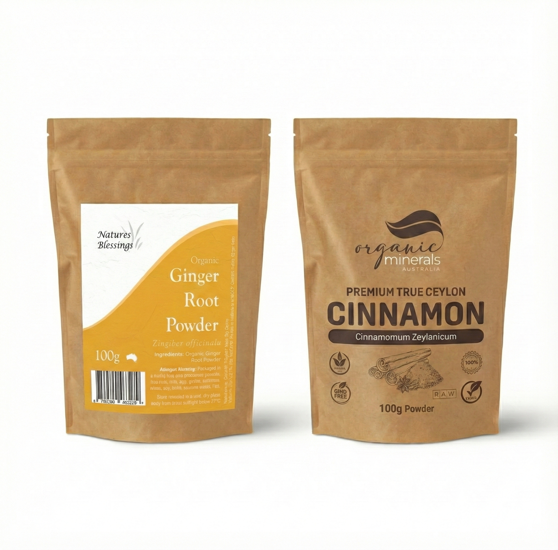 Harness the warming power of two essential spices in one convenient bundle. Our Christmas Spice Pack combines premium ginger and cinnamon; both celebrated for their antioxidant properties and digestive support. Ginger delivers a sharp, invigorating warmth ideal for teas, smoothies, and cooking, while cinnamon offers a naturally sweet complexity that stabilises blood sugar levels. Perfect for seasonal wellness routines, festive baking, or daily nutritional enhancement. Sourced with the same quality standards as our supplement range, this dual-spice collection brings functional nutrition to your kitchen year-round